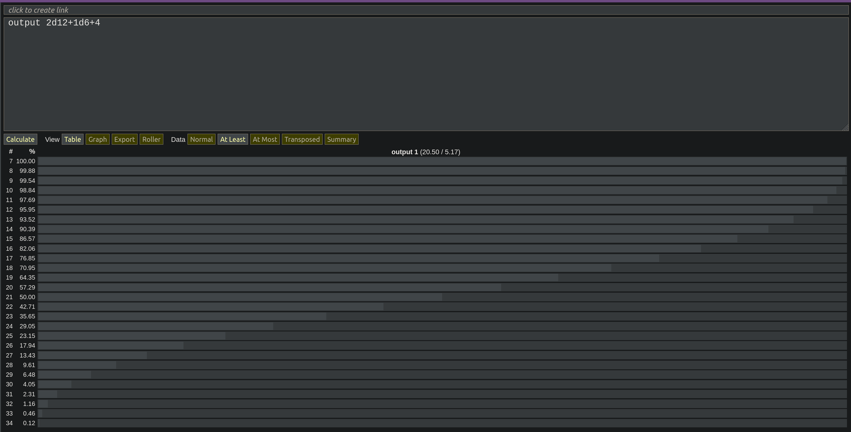 This shows the the odds a taleweaver will succeed on a roll of a given difficulty, assuming no modifiers; versus the odds a PC will succeed on a roll of the same difficulty, again with no modifiers. On unmodified rolls, the average character roll will be three points higher than the average taleweaver roll. Looking at difficulty 10, we see the taleweaver die will roll it fifty-five percent of the time, while a PC will pull it off seventy-five percent. At difficulty 15, those percentages shift to thirty and thirty-eight. And at difficulty 20, they’re five and ten. Plus, notice that the PC scale goes all the way out to 24, which the taleweaver scale stops at 20. These might not look like much, but before I unpack this any further, I want to offer a quick lesson in how to read percentages; it’s the key to understanding why these small changes in small number make such a big difference.